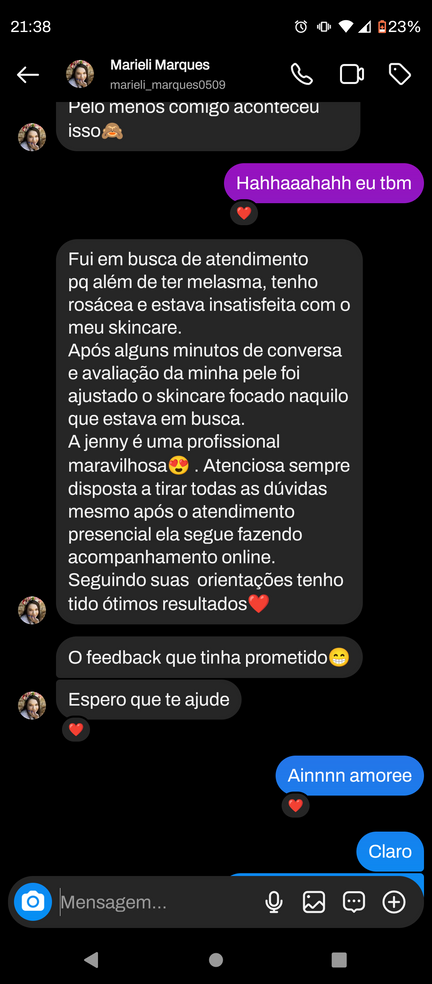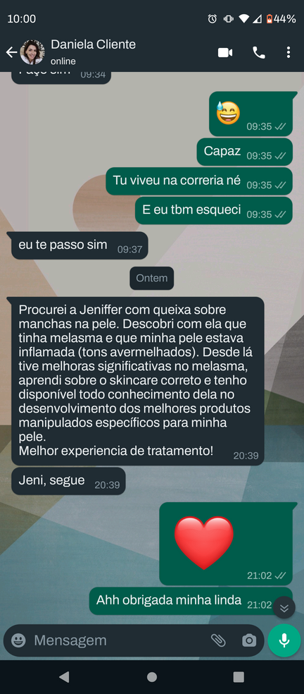 Me chamo Jeniffer, sou uma eterna estudante e apaixonada por Estética e Cosmética e ja possuo mais de 200h em cursos de especialização na área estética, sempre focando na saúde da pele e na naturalidade dos resultados. Atuante em consultas de avaliação quase 3 anos com resultados reais, sempre buscando conhecimento para ser cada vez mais assertiva em meus tratamentos, mesmo a distância.